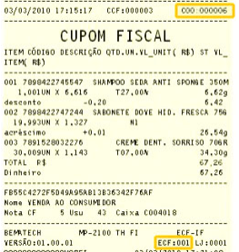 O COO (Contador de Ordem de Operação) fica na parte superior do cupom, e o ECF (Emissor de Cupom Fiscal), na parte inferior, como mostra a imagem abaixo: